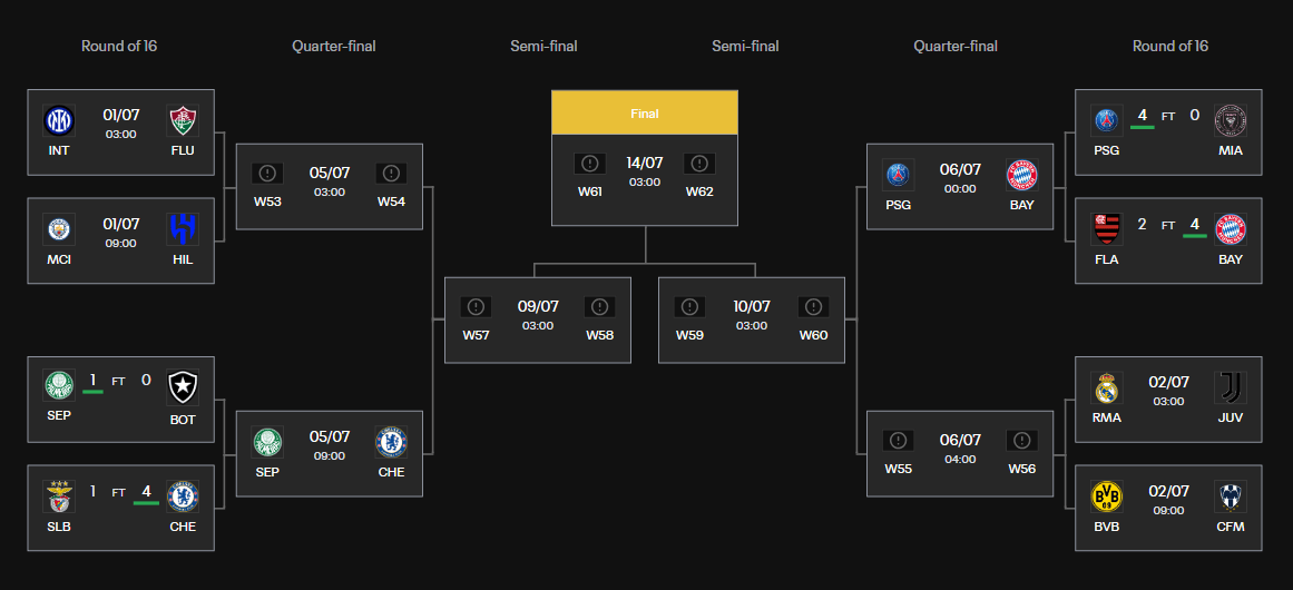 世俱杯形势:巴黎拜仁捉对 皇马战尤文 国米再遇曼城? admin 2025年06月30日 09:30 99 0 北京时间6月30日,世俱杯1/8决赛再赛2场,巴黎圣日耳曼4-0大胜迈阿密国际,拜仁慕尼黑4-2大胜弗拉门戈。至此本届世俱杯8强已有4支球队产生。帕尔梅拉斯将对阵切尔西,胜者将对阵的球队可能为国米、弗鲁米嫩塞、曼城或利雅得新月。巴黎圣日耳曼将与拜仁慕尼黑捉对厮杀,胜者将对阵的球队可能为皇马、尤文、多特或蒙特雷。1/8决赛还剩下4场比赛要打:7月1日3:00 国米VS弗鲁米嫩塞7月1日9:00 曼城VS利雅得新月7月2日3:00 皇马VS尤文7月2日9:00 多特VS蒙特雷 标签: #决赛 #拜仁慕尼黑 #对阵 #尤文 #拜仁 #利雅得 #切尔西 #国米 #曼城 #巴黎圣日耳曼 #蒙特雷